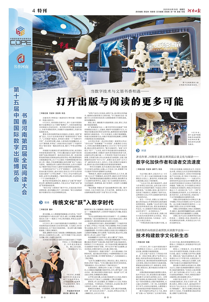 8月28日,第十五届中国国际数字出版博览会、书香河南第四届全民阅读大会在郑州启幕。6大展区、600余家参展企业、23个省区市组团亮相,一场文明与数字碰撞的盛宴,于黄河之畔展开。