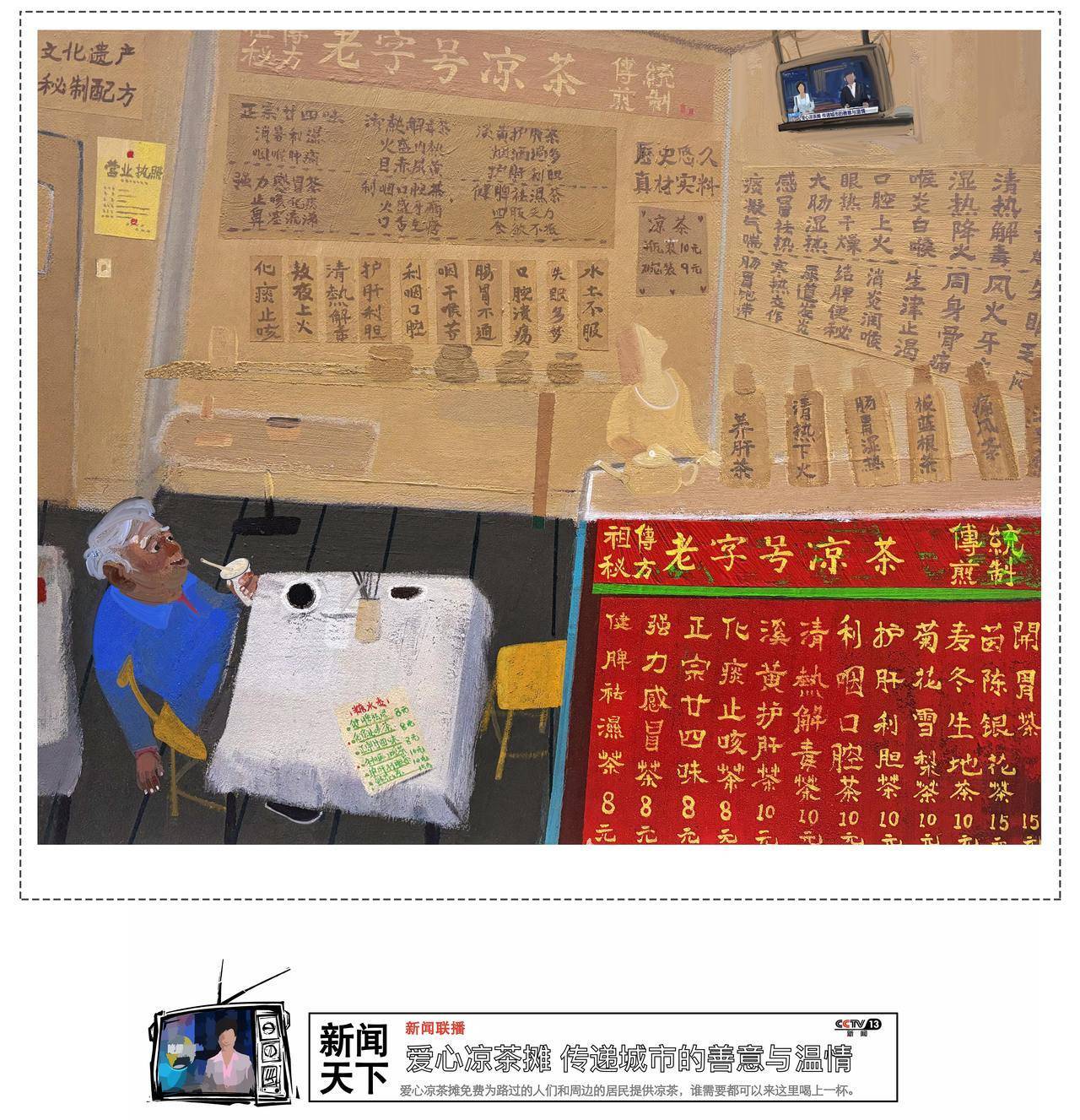 《新闻联播》展示了两广地区百姓的爱心凉茶摊的日常生活场景,电视成了连接人们与世界的重要纽带。画面中,忙碌一天的人们可以放松心情,“葛优躺”在电视机前,专注地观看新闻联播,连服务员也抬头关心电视里播放着国内外的重大新闻事件,大家的目光聚焦在同一个世界。通过一实一虚的场景描绘,突出了城市善意与温情。也凸显新闻在人们日常生活中的重要地位。