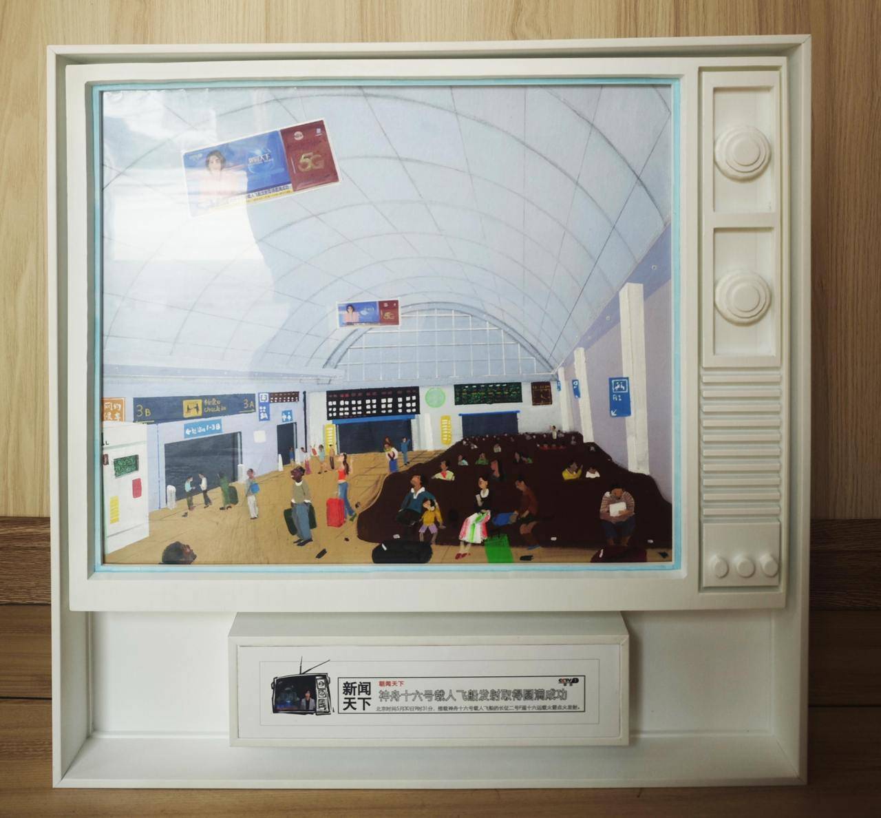 这种展示方式在审美体验上实现了重大突破。传统的插图多以二维平面的形式呈现,观众的审美感知主要局限于平面的画面内容。而《新闻达天下》通过将插图与3D打印的电视机框架相结合,成功地将观众的审美体验从二维平面拓展至具有空间感的立体欣赏维度。这种立体的审美体验使观众能够更加身临其境地感受作品所营造的氛围,增强了作品的感染力和吸引力。